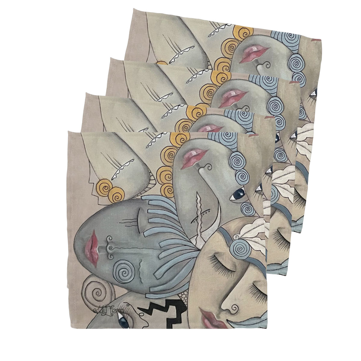 The napkins are sold in sets of 4 with each napkin displaying a unique design.