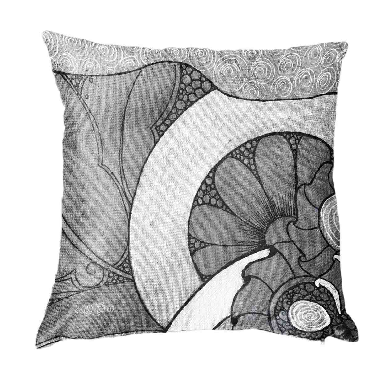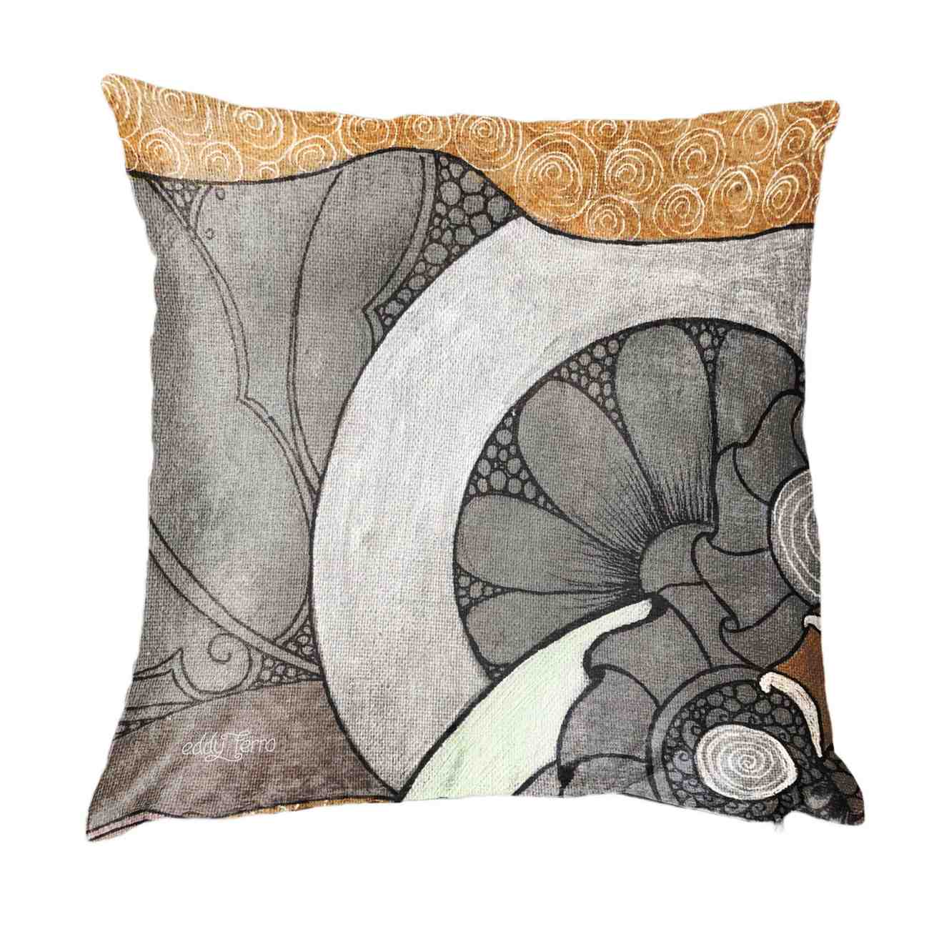 The Royal One Scatter Cushion by South African artist Eddy Ferro radiates elegance and strength. Its hand-painted abstract design features bold circular motifs, intricate linework, and regal accents of gold, grey, and black, all printed on luxurious velvet for a timeless finish.