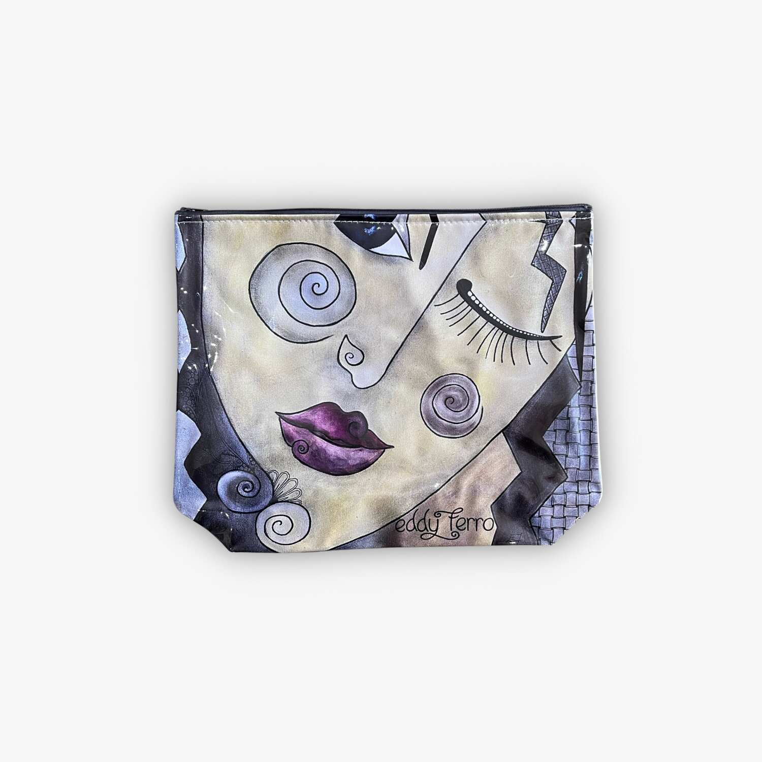 The Twirls & Rays Cosmetic Bag is a unique design that has been hand-painted by South African Artist Eddy Ferro and printed onto a PVC material that is waterproof both inside and outside and easy to wipe clean. The ideal cosmetic bag for you. This unique Cosmetic Bag stands out from the crowd with her unique design details, function and form. This bag brings a pop of colour to your style choices and makes a great gift.
