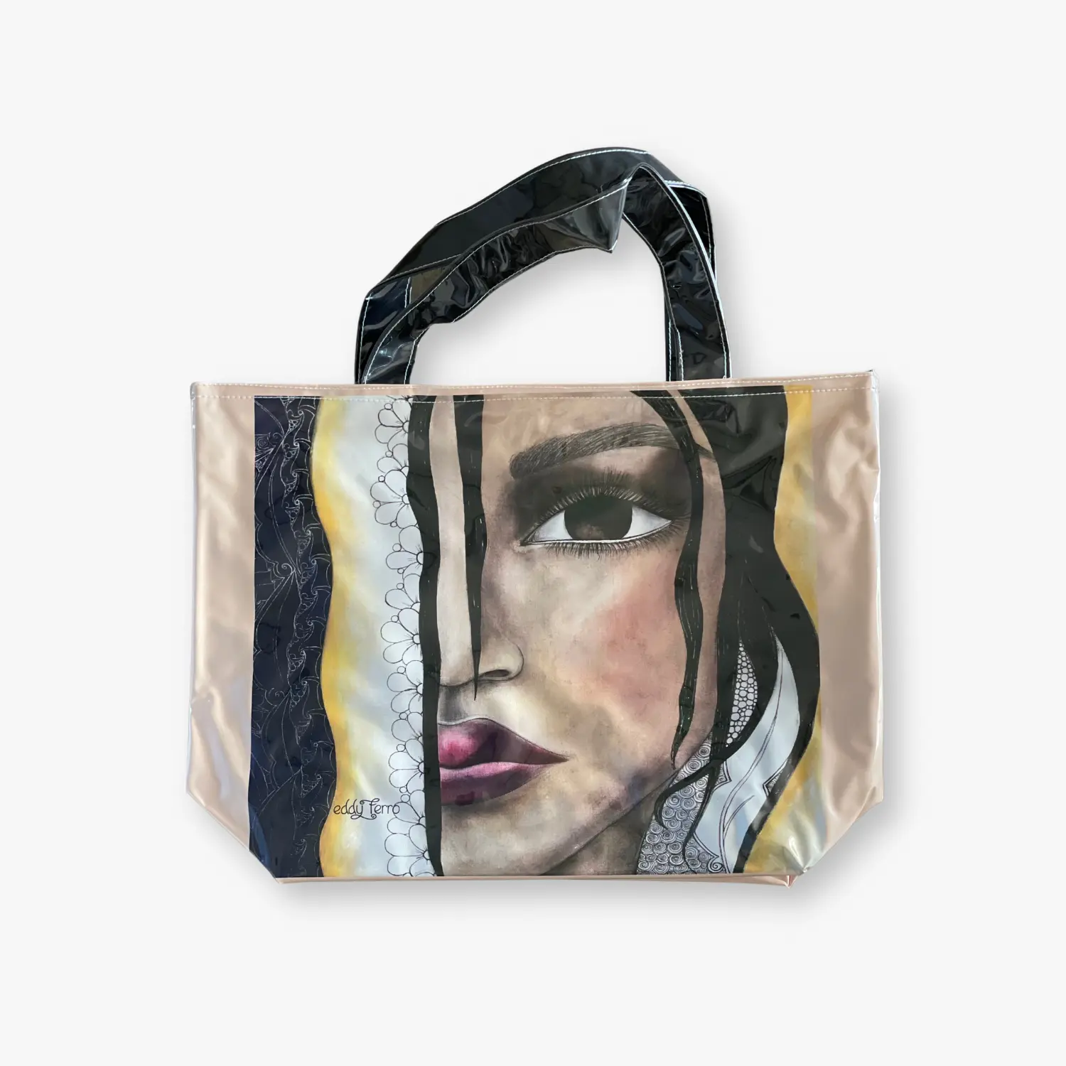 The Velvet Anna Beach Bag Tote is a unique design that has been hand-painted by South African Artist Eddy Ferro and printed onto a PVC material that is waterproof both inside and outside and easy to wipe clean. This unique Beach Bag stands out from the crowd with her unique design details, two inner pockets and magnetic clip. This bag brings a pop of colour to your style choices and makes a great gift.